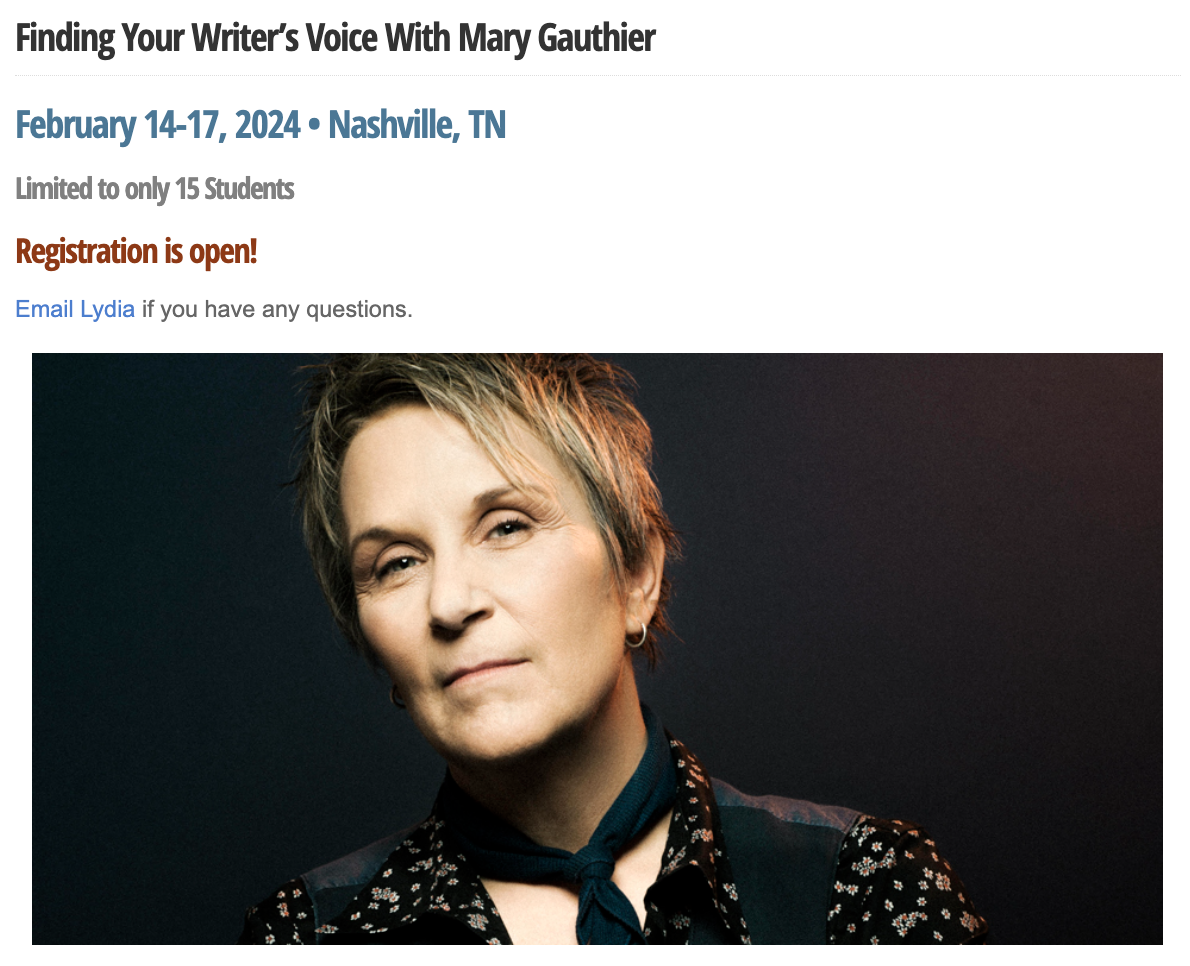 NEW 2023 Online Workshop! Songwriting with Mary Gauthier